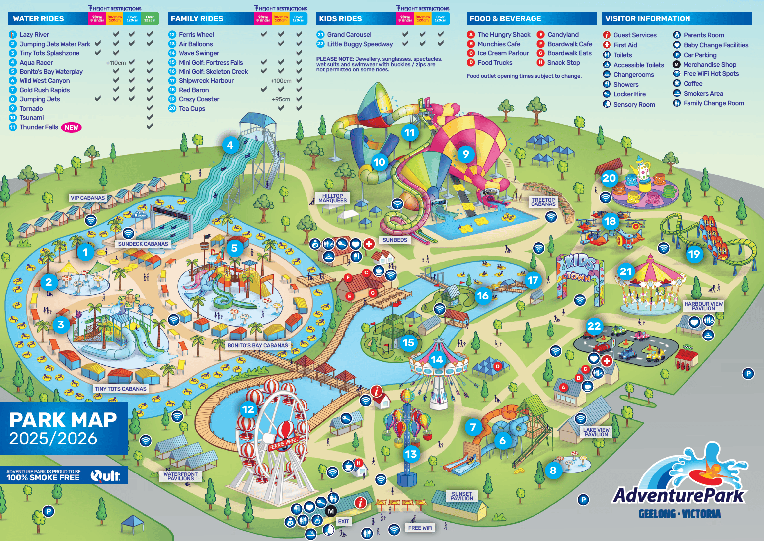 Find rides and attractions, food and beverage outlets, and services and facilities throughout the Park.